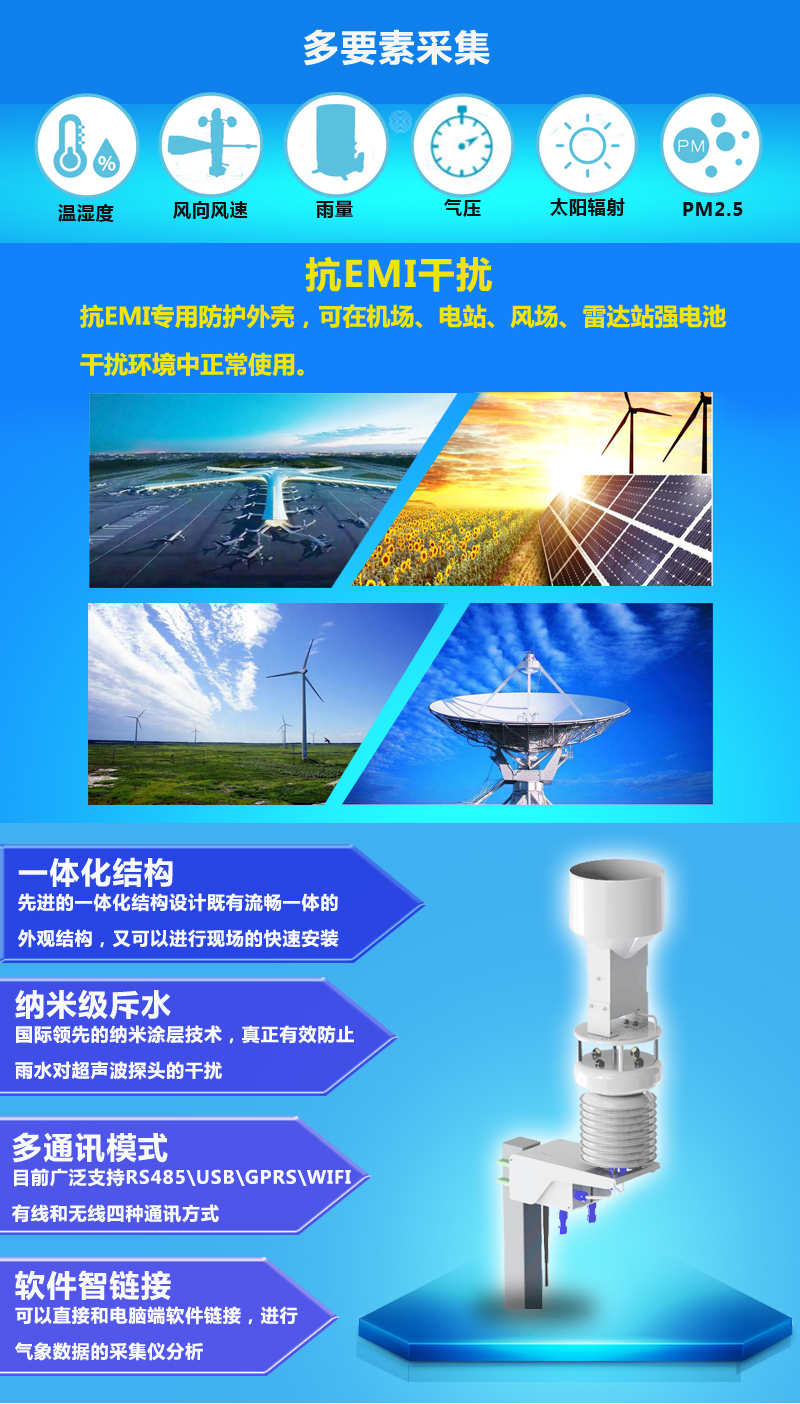 1、輸出2~10個氣象要素: 大氣溫度、環境濕度、風向和風速、降雨、氣壓、太陽輻射、PM2.5、土壤溫度、土壤濕度、氣體濃度